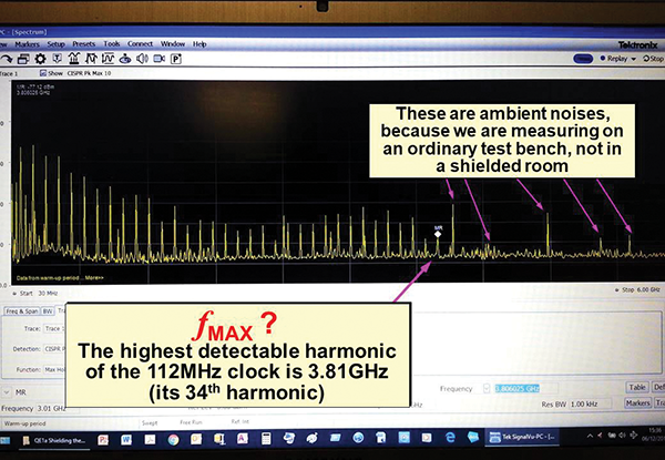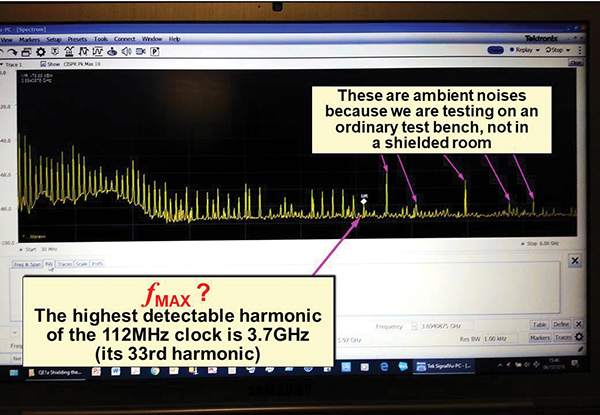 For example, clock traces on PCBs are often longer than λ/10 at their fMAX. Figures 12 and 14 showed that the fMAX of the 112MHz-clocked devices measured was almost 4GHz, and many modern devices have higher fMAX values than this. In an FR4 PCB: λ/10 at 4GHz is 3.75mm, and since all of the clock traces on the PCB (and many, if not all, of the other traces) are longer than this, they need to either be filtered to reduce their fMAX, or designed using matched transmission-line techniques, both as described in [13] and in my PCB EMC book [4].