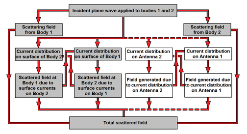 Figure 2: Flowchart for analyzing two-body scattering proposed by Elsherbeni and Harmid, expanded to include the case where bodies contain current-carrying antenna structures.
