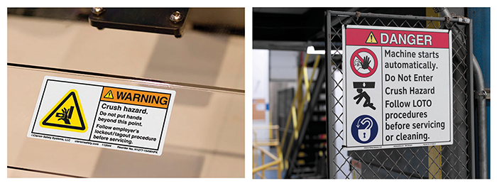 As an example, think about a machine that has moving parts, creating a crush hazard. The hazard can’t be eliminated so the manufacturer installed a guard on the machine and placed a warning label on the guard that says, “Crush hazard. Do not operate with guard removed. Lockout/tagout before servicing.” See the safety label example in Figure 2.