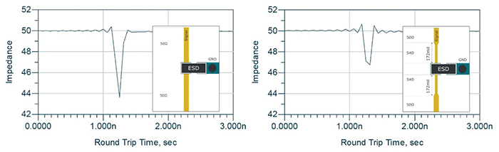 From the microwave theory’s point of view, the increase of the impedance means that trace becomes more “inductive,” which in our case can compensate for the capacitance of the ESD protection device. In the impedance profile, it can be observed that the microstrip line pushes the impedance at the ESD device back to the targeted system impedance, e.g., 50 Ω, as shown in Figure 1b.