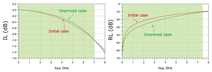 In addition to the time domain simulation results previously presented, a performance improvement can also be observed in the frequency domain. Looking at the simulated S-parameters, shown in Figure 5, the bandwidth shows an increase up to 7.5 GHz for the IL and RL.