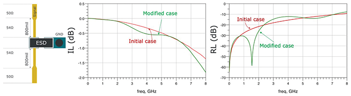 Based on the concept introduced before, a short section of the transmission lines on both sides of the ESD device is tuned to an impedance of 54 Ω. The resulting microstrip line dimensions are shown in Figure 3b. A simulation of this design yields an improvement of the overall impedance profile as can be seen in Figure 3b. The impedance drop can be successfully reduced from roughly 43.5 to 47 Ω which is typically within the SI requirements.
