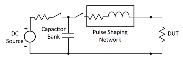 Most often, a double exponential test pulse is produced by a test pulse generator specifically designed to this purpose. The basis of many double exponential test pulse generators is depicted in Figure 2. It makes use of reactive components to store the energy and shape the waveform. For these types of pulse generators, the loading impedance of the device under test (DUT) itself is a factor that must be taken into consideration in determining the pulse waveform. As such, it can be an iterative process to set up this kind of pulse generator to get the desired pulse amplitude, rise time, and duration. Appendix E of ISO 7637-2 describes how to calculate the energy delivered to DUT by a double exponential pulse.