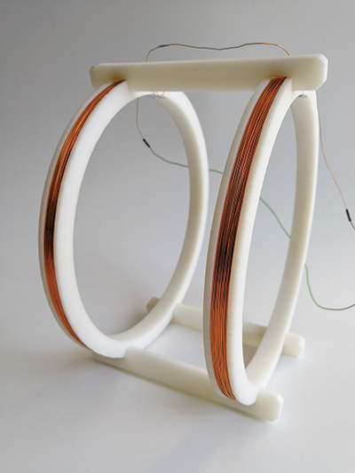 Two coils placed in parallel along the same axis can produce a relatively uniform magnetic field between the coils, This configuration is known as a Helmholtz coil, named after the German physicist Hermann von Helmholtz. Three pairs of Helmholtz coils can be configured on the X, Y, and Z axis, allowing for complete control of the magnetic field in the center of the configuration.
