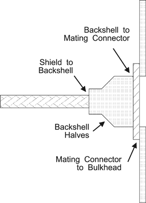 For shielded cables, the cable shield needs to be well terminated to the enclosure. Again, this requires a number of metallic connections, including cable shield to backshell, backshell to connector, connector to mating connector, mating connector to bulkhead. If any of these connections are not low resistance and around the entire perimeter, the shield will fail. To be specific, the cable shield needs to be circumferentially terminated to the perimeter of the connector, typically at the compression ring for military style connectors. Pigtail connections are unacceptable. Full circumferential conductivity needs to be maintained through to the bulkhead. The connectors are designed to mate to each other. The connector to bulkhead connection must be complete, as well – specifically, watch for conductivity at the mating surfaces. Paints, rubber gaskets, and nonconductive coatings are of concern.