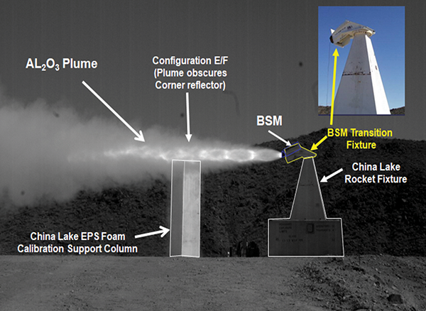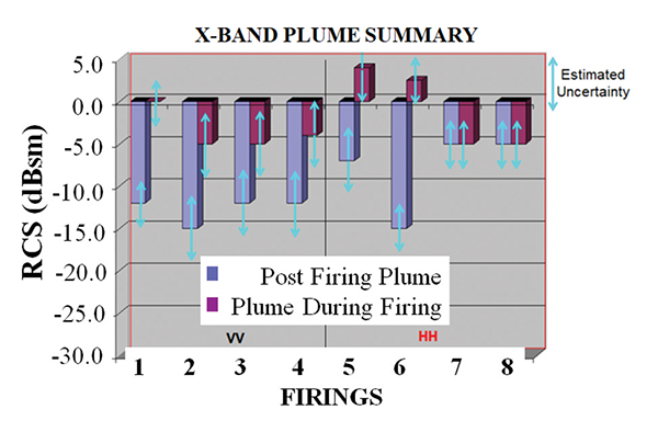 Working with the USN, NASA and AFRL devised a plume RCS test by firing a series of six individual BSM motors on a captive engine stand at China Lake while measuring the plume and debris signatures. Figure 9 shows the test set-up and Figure 10 shows a sample of dynamic plume data. Indeed, the smoke cloud filled with particulate Al2O3 acted like a giant radar chaff cloud for a few seconds. It also explained why it was going to be nearly impossible to transmit any radar energy directly up to and through the rear end of the Shuttle Al2O3 plume during ascent to “detect” unwanted ascent debris events within the Shuttle stack.