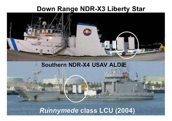 The photo sequence in Figure 11 shows the original 2004 NCAR site and its transformation to its present form. Figure 12 shows the combined “field of view” of the ascending Shuttle as seen from the fixed C-band NCAR site plus the two, ship-deployed X-band Doppler radar sites. Figure 13 shows the two Dutch-made Weibel Doppler radars deployed downrange on the NASA SRB recovery vessel Liberty Star and on a U.S. Marine Runnymede class LCU.