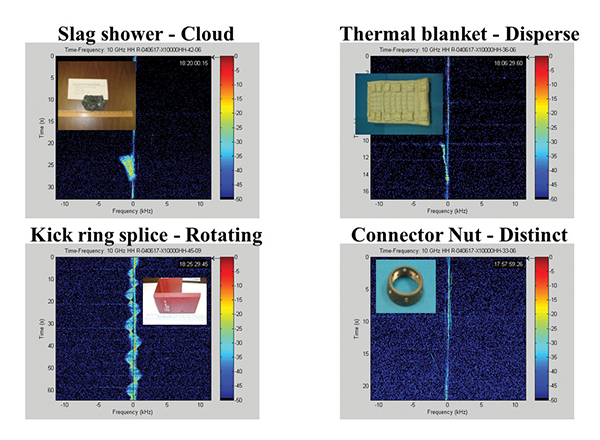 After compiling data on hundreds of sample combinations, yet another “realism” test was executed. The US Navy loaded up about one-third of the heavier samples, and ejected them from a C-130 Hercules at 10,000-foot altitude. The debris pieces were tracked and RCS characterized with Doppler instrumentation radars out of Patuxent River, MD. Figure 15 shows 4 samples whose dynamic tumbling signatures were measured. This also help correlate the Bn analysis for each sample.
