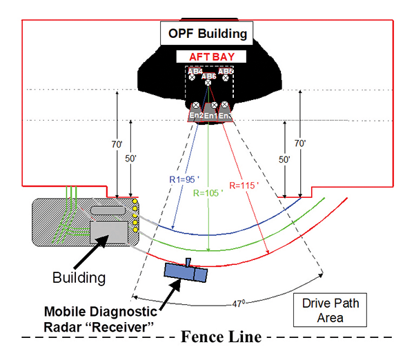 During the test, the target was static with all normal work stands in place. The translator platforms behind the aft section of the Shuttle were moved completely to the side to avoid line-of-site blockage between the aft bay and the receiver. In order to achieve the test objectives, the Orbiter was placed in as near-flight condition as possible to simulate ascent attenuation characteristics. Three semicircular drive paths represent a constant mean range between the Orbiter aft bay centroid and the receive antennas during the RF attenuation tests. Attenuation data was obtained for three separate ranges (95, 105, 115 ft) and multiple receive antenna heights (10, 15, 20 and 25 ft). The Cross-X’s in Figure 16 represent six Vivaldi broadband antennas inserted inside the aft bay, three by the rear avionics bay wall and one next to each of the Shuttle’s main engine computers.