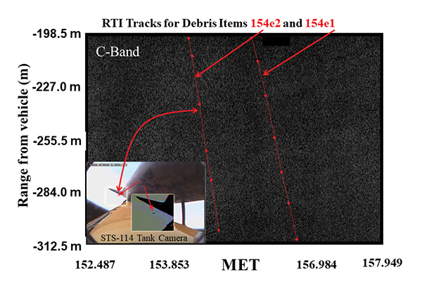 Almost immediately, we got our first challenging debris release. The external tank for the STS-114 return to flight system had been modified to remove much of the foam pieces that had a history of liberation in previous flights. But the first completely new tank design would not be delivered to NASA for three more flights, so everyone expected some foam debris events. One foam release was detected by the on-board external tank camera (inset of Figure 26) which raised immediate concerns. It was a very small piece of foam debris, a tiny fraction of the size of Columbia’s bipod ramp foam release. The camera clearly saw it depart and fly between the orbiter and tank, striking nothing. Despite its small size and very small corresponding RCS, the NDR not only detected this piece, but another smaller foam release the camera could not see. On its very first operational mission, the NDR proved that it could accomplish the debris detection and identification of material based on a combination of RCS, the location of the release, and its ballistic properties, Bn. So the ID strategy that effectively worked in the Columbia FD2 object investigation worked for Return to Flight ascent debris.