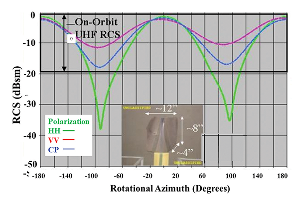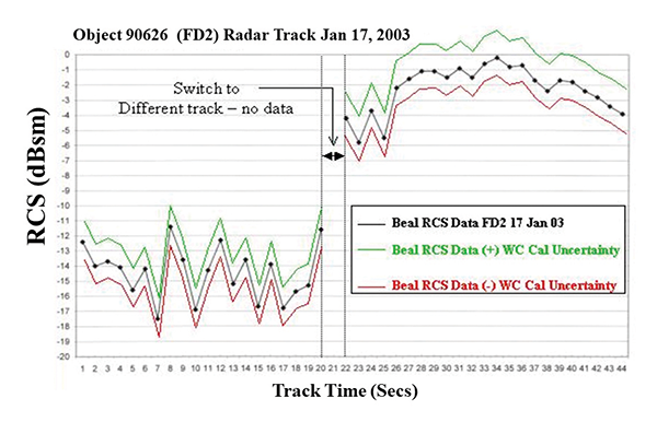 As a radar signature expert, I must explain that every radar target has a property called “radar cross section” (RCS) that is a measure of how an object scatters radar energy in all directions. Generally RCS is denoted by the symbol σ, with SI units of m2 or dBsm. RCS generally varies with the frequency of the radar and 32the orientation of the target with respect to the radar. Since the FD2 object tumbled in space, ground radar sensors saw a varying RCS versus time.