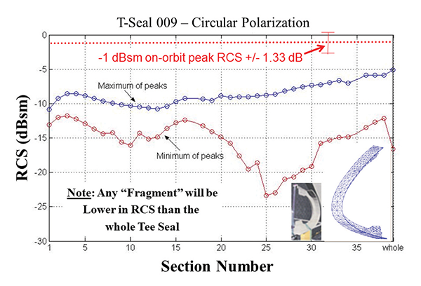 Within weeks of the May 6, 2003 CAIB briefing, AFRL executed a complex computational electro-magnetics (CEM) RCS analysis of all 26 Orbiter tee seal geometries (in whole or in fragments) and definitively showed through this analysis that the tee seal could not be the FD2 object (see Figure 6). Finally, subsequent forensic analysis of fractured left wing edge debris pieces recovered from the multi-state debris field showed significant cerachrome alloy melted onto surrounding recovered edge fragments, so therefore the spanner-beam insulator was present during re-entry. This meant the only material that could meet all the criteria of the FD2 object was a fractured piece of RCC edge originating from panel 8, 9, or 10 on the left wing of at least 90 in2 in area. None of the other 23 materials fit the combined exclusionary criteria of having the correct RCS, Bn, and also be forensically supported by other evidence. Hence, through careful EM analysis and high-quality RCS testing, AFRL provided critical EM data supporting the Columbia accident root cause, both of which were cited in the CAIB main report and technical Annexes. [1]