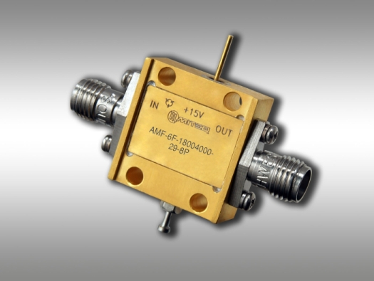 Model AMF-6F-18004000-29-8P is a recent addition to MITEQ’s family of low noise, wideband, and ultra-small coaxial LNAs in the 18 to 40 GHz band. This LNA has over 35 dB of gain in a housing that is only 0.38” long and 0.75” wide without the field replaceable 2.93mm connectors. Gain flatness is a maximum of ±3.0 dB. The AMF-6F-18004000-29-8P has a maximum noise figure of 2.9 dB in the full band, though the typical value is 2.6 dB. This unit operates from -40 to +75°C, has an output P1dB minimum of +8 dBm, output IP3 of typically +16 dBm and a current draw of maximum 275 mA from a single +15V DC supply. The aluminum alloy housing provides excellent thermal performance in addition to being very small and light. This model is also available in a hermetic version, wider frequency, lower gain options, and as a RoHS compliant unit.