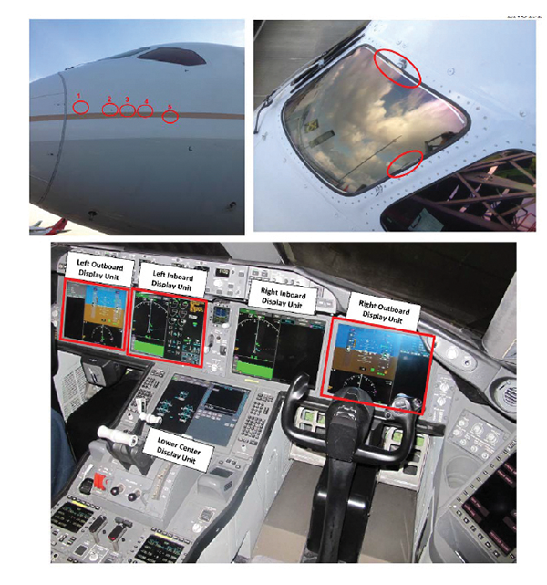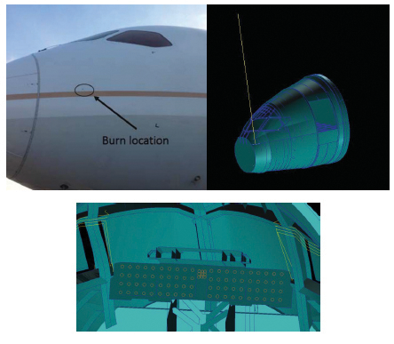 After landing, LHR maintenance performed a lightning inspection and found external nonstructural damage in five locations along the nose. A power reset to the aircraft per maintenance manual procedures was accomplished, and the displays and other effected systems returned to normal function. After a review by United maintenance personnel, the aircraft was approved for dispatch and continued the flight to Houston with no further faults noted. Figure 1 shows the location of lightning attach points and the three affected displays.