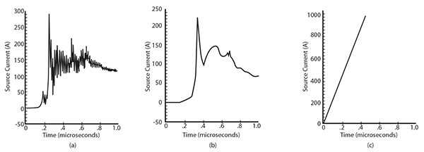 To quantify these ratios at the exact same observation point, we employed a numerical simulation of these events based upon the 3D finite difference method. The simulations assume attachment at the nose with a tail exit. We considered four sensor locations; underneath the nose, on the side of the fuselage above the right-wing root, the tail, and in the middle of the underside left wing. Measured lightning currents from two in-flight strikes were used as sources, as well as a source current consisting of a linear ramp to a constant current with a 500 ns rise time. The current sources are shown in Figure 10. These sources are very small compared to lightning current waveforms in SAE ARP 5412.