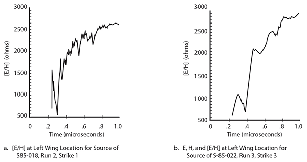 To quantify E/H, we appeal to the F-106 research program [4,5], and we consider the transient digitizer data for the fast part of the events. The data is somewhat limited in application because the E- and H-field sensors are not located at the same place. However, if we consider the D-dot forward sensor on the fuselage under the nose and a tangential magnetic field derivative sensor on the fuselage near the top of the right-wing root, one can estimate the ratios of the peak values of dE/dt to dH/dt. The result is that for the measurements evaluated, it was found that this ratio was on the order of 1000 Ω.