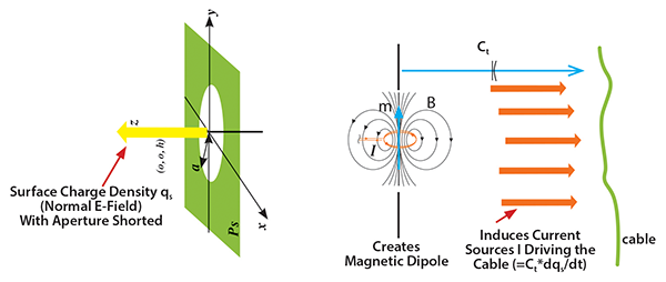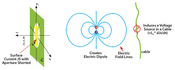 We see that the surface current density that would flow across a shorted aperture creates an electric dipole in the aperture. This dipole induces voltage sources in series with the cable according to a transfer inductance Lt.