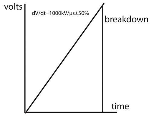 Voltage Waveform A (shown in Figure 16) is the one most relevant to our discussion. This waveform rises at a rate of 1000kV/µs (±50%) until its increase is interrupted by voltage breakdown of the intervening air gap, resulting in the puncture of, or flashover across, the object under test. At that time the voltage collapses to zero. The rate of voltage collapse or the decay time of the voltage if breakdown does not occur (open circuit voltage of a lightning voltage generator) is not specified.