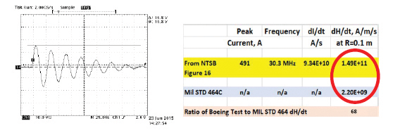As an example, consider Figure 16 of the NTSB report, which is analyzed in Figure 5. This shows the discharge current for one of the DU parallel plate test shots. The peak current level is 491 A. The magnetic field 0.1 m (presumably in the location of the DU) from the discharge path is shown to be a factor of 68 larger than the MIL-STD-464 dH/dt. This brings up the question whether dE/dt, dH/dt or a combination, is the cause of the DU blanking.