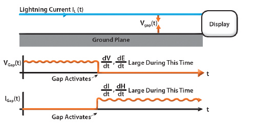 The results showed that, based on the lower blanking thresholds demonstrated during the near strike lightning testing and the flat plate testing, the computed E-fields on the DUs exceeded the lower bound estimate of the display blanking threshold during every case where a “fast” spark gap (activated within 0.5 ns) fired or a waveform H was utilized.