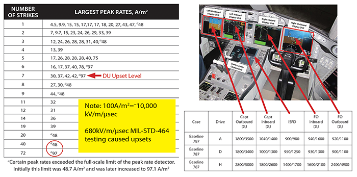 - Boeing CEM analysis shows E-fields on cockpit DUs exceeding 1000 kV/m/µs;