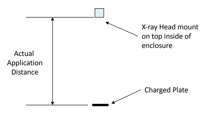For x-ray ionizers, the CPM plate should be placed inside the end user safety enclosure where the ionizer is operating. Safety procedures to verify x-ray leakage should be followed prior to compliance verification testing. The CPM plate should be located at the center of the enclosure, or at any other repeatable location depending on the application. The distance of the CPM plate from the x-ray ionizer should be chosen by the end user. A proposed test location for compliance verification of x-ray ionizers is shown in Figure 14.