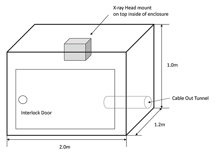 Air ions are produced along the path of the x-ray (approximately 1000 mm [40”] in air) and do not require electric field or airflow to distribute the ions. For radiation safety, testing of x-ray ionizers should be performed inside an enclosure which prevents accidental x-ray exposure to personnel. Typically, this will include some type of safety enclosure for the x-ray source and electrical interlocking to turn the x-ray source off when the enclosure is opened. See Figure 4 for an example of the dimensions of this safety enclosure. Figure 4 illustrates only the dimensions of the x-ray test enclosure. Information on construction techniques, materials to be used, and operating procedures should be obtained from manufacturers of x-ray ionizers or appropriate standards [4].