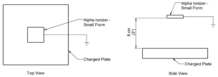 The CPM plate should be installed 15 cm (6 inches) from the test surface. Unless otherwise specified, the test surface should be static dissipative or conductive and properly grounded. The test technician should be properly grounded. The non-airflow alpha ionizer should be installed 7.5 cm (3 inches) above the CPM plate. The space between the ionizer and the CPM plate should not contain airflow obstructions. End users can follow these suggestions, or they can test non-airflow alpha ionizers in the same configuration and distance as they intend to use.