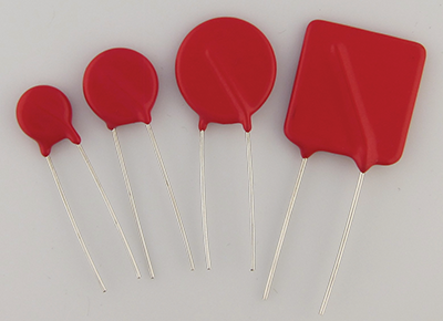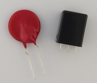 Option 2 is an increasingly common compliance method. Several vendors of MOVs offer thermally protected MOVs (TP-MOVs) that have a thermally activated thermal fuse coupled to the body of the MOV. Figure 3 shows two examples of TP-MOVs. The slight bulge on the side of the red TP-MOV is the thermal fuse. In the black TP-MOV, the MOV and an external thermal fuse are closely coupled within the enclosure.