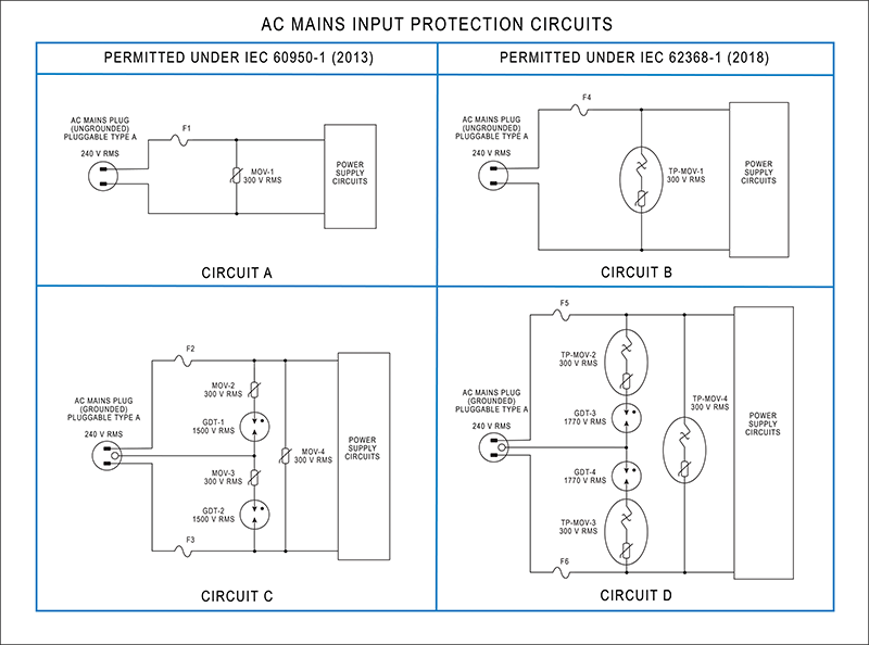The discussion that follows will compare representative AC mains protection circuits that comply with IEC 60950-1 (Second Edition, as amended through 2013) and representative circuits that comply with IEC 62368-1 (Third Edition, 2018). The discussion will be limited to Pluggable Type A equipment. Figure 4 shows four different protection circuits that illustrate the range of possible solutions.