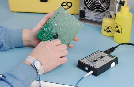 In addition, the use of continuous monitors should be evaluated. Wrist strap continuous monitors (Figure 2) will provide the benefit of detecting intermittent fault conditions, such as a coil cord wearing out or an operator having the wristband too loose. These will often not be detected by daily or even twice daily touch-testing. There are new models with technology that, besides monitoring the ground of operators and worksurfaces, will also alarm when body voltage exceeds 2.5 volts and alert the operator to actions, movements, or materials that are causing the operator to become charged.