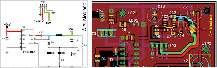 A +24Vdc level is converted to +5V with a TPS5410D IC. The layout of input and output signals to the converter is marked in color.