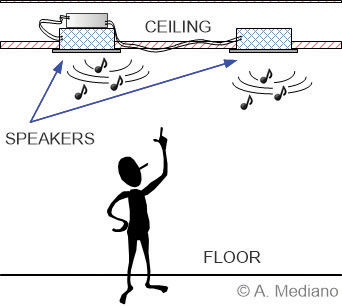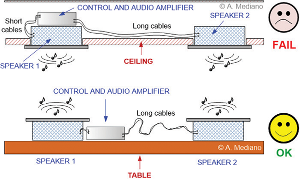 I will explain a situation I suffered some years ago while troubleshooting an audio product with EMI problems: two speakers to be installed in ceiling with typical application at home, hotels, offices, etc. (Figure 1).