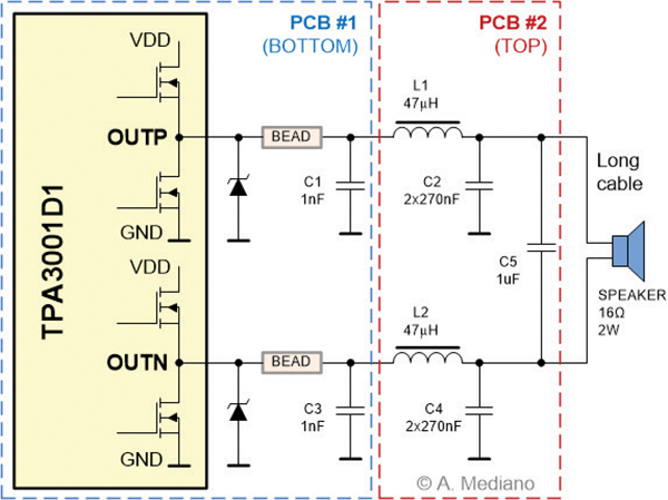 For our product, a Texas Instruments TPA3001 monaural class D power amplifier was used. The amplifier was included in a small PCB referred as PCB#1 in Figure 3.