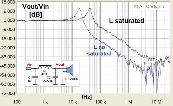 The response of the filter was measured and results appear in Figure 5. The ratio Vout/Vin was measured with and without the speaker on top of the inductors. Around 12dB higher is the response of the filter in the 250kHz-10MHz range for the saturated case (note the dangerous underdamping response of the filter).