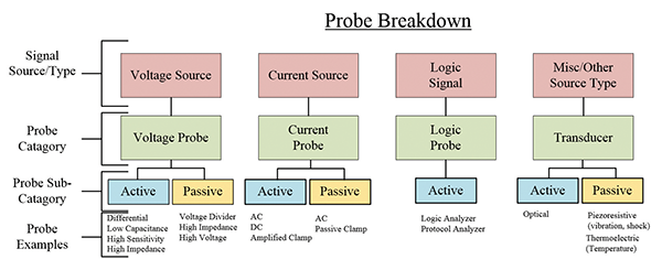 There are a variety of probing options that manufacturers offer to best suit the application. To choose the most appropriate one to match the application, you must first recognize the signal source being measured. To do this, we can categorize signal sources to the following categories summarized in Figure 14, described as: