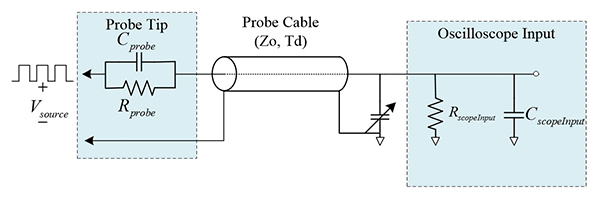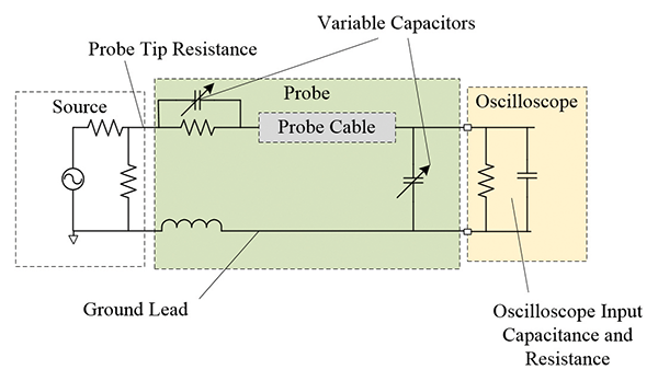 While there are a variety of probes to choose from, engineers will almost always be faced with a standard voltage-based probe multiple times in their careers. It is important to understand that many of these probes offer compensation via a (often-ignored) set screw on the housing, as these probes need to match the input capacitance and resistance to that of the oscilloscope to which they are connected. To further understand this, the probe model in Figure 18 is expanded to include the probe, probe body, the probe cable, an optional tuning box and the oscilloscope input.