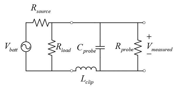 As mentioned, the second physical characteristic that affects the measurement is the probe clip inductance; as a wire it has some amount of distributed inductance in the measurement loop. Shown in Figure 11, this inductance can form a resonant LC circuit which could result in ringing with only the input resistance of the probe for damping.