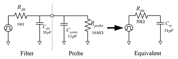 To illustrate the effects of capacitive loading, a model of pulse generator driving a RC filter is introduced in Figure 9. We can simplify the circuit since the large impedance offered by the probe won’t affect the source resistance of the source, and because of the parallel capacitance that is added to the filter.