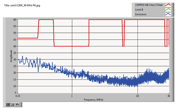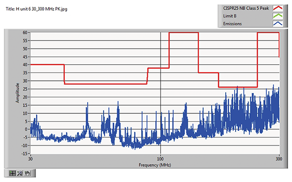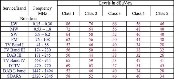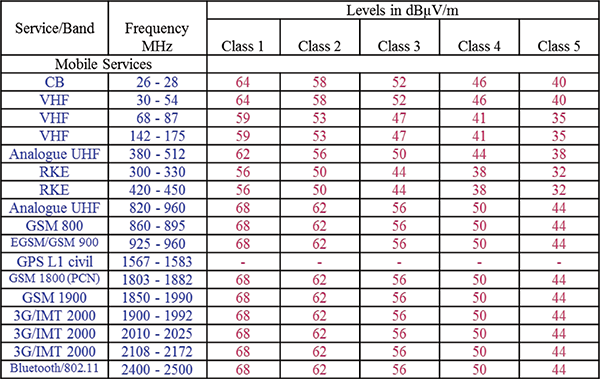 CISPR 25 radiated emissions measurements are performed in the frequency range 150 kHz – 2.5 GHz. Peak limits for broadcast bands are shown in Figure 9, while the peak limits for mobile services are shown in Figure 10.