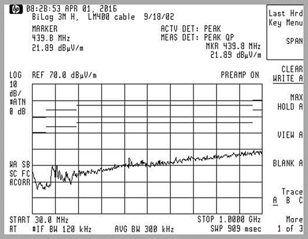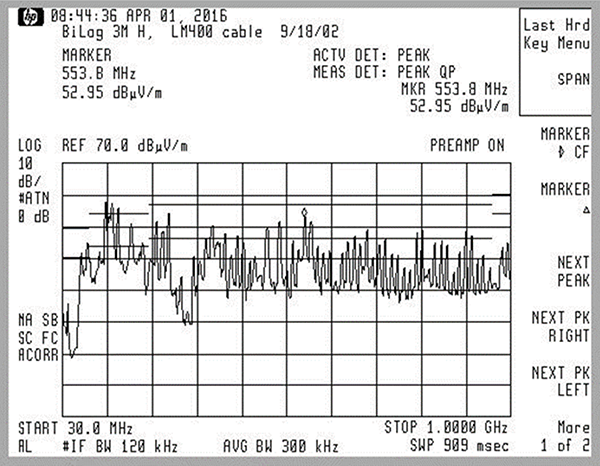 The ambient measurement is then followed by the DUT emissions measurement, like the one shown in Figure 8.