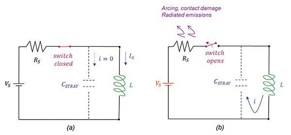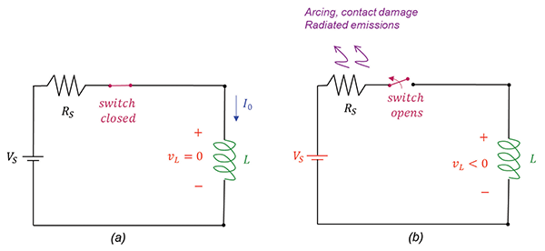 When the switch opens, a large negative voltage develops across the inductor and subsequently the switch. The magnetic energy stored in the inductor is dissipated in the arc across the switch contacts or is radiated, as shown in Figure 1(b).