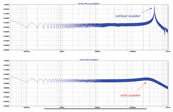Figures 14 and 15 clearly show the dramatic improvement of the RC-snubbed circuit response compared to the un-snubbed one.