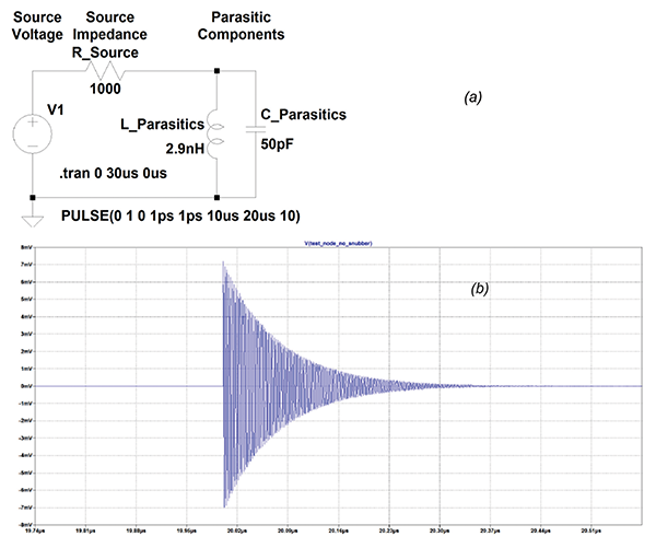 The impulse voltage generated at the switching node stimulates the parasitic components to resonate as a damped LC network. The purpose of the RC snubber placed across the low-side switch is to reduce these oscillations to an acceptable level.