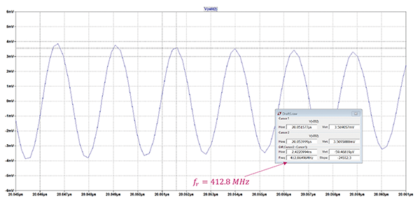 A close-up of the ringing waveform shown in Figure 8, reveals the ringing frequency of 412.9 MHz.