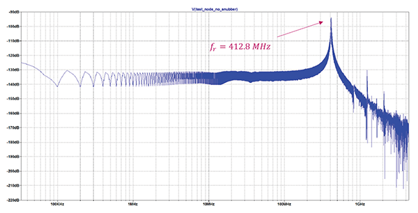 Note that the resonant frequency increased from the capacitive snubber value in Figure 11 but is still much lower than that of the un-snubbed circuit.