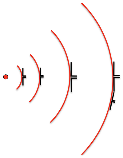 Now for the distance from an observation point to any point along an extended structure to be equal, the observation point must be infinitely far away. Similarly, a plane surface may be described as the surface of a sphere of infinite radius. But none of that is very practical for daily use. Instead, we decide on how closely our spherical surface needs to approximate a plane surface, typically by positing a maximum phase difference between any two lines from the observation point to different portions of the transmitting source. Figure 2 shows this process specifying the allowable variation from a plane wave as a fraction of a wavelength.