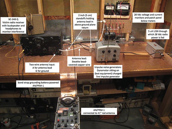 “These limits were decided upon as a result of tests made on a BC-384Q receiver installed in a shielded room. A 24-inch lead-in and a 12-foot straight wire antenna outside the shielded room were used to simulate an aircraft set-up. Various types of radio interference sources such as d-c motors, poorly shielded dynamotor cables, an adjustable output ignition source, etc., were installed at a distance of one foot from the lead-in. At those frequencies where interference sources happened to produce an interference signal which was slightly above the background of the BC-348Q, a measurement was made with an AN/PRM-1 in conjunction with its rod antenna. The rod was located one foot from the noise source, and the resultant measurement was taken as an approximation of the desired radio interference limit.”