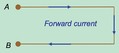Upon reaching the point B the current travels to the reference plane and returns to the source (A). Current returns to the source through the path of least impedance. At high frequencies, the return current takes the path of least inductance, which is directly underneath the forward current trace, because this represents the smallest loop area (smallest inductance). This is shown in Figure 3 (not drawn to scale).