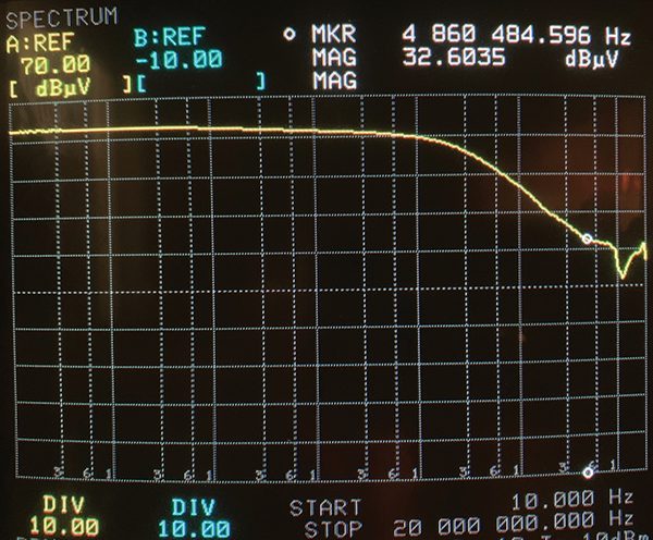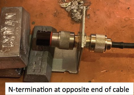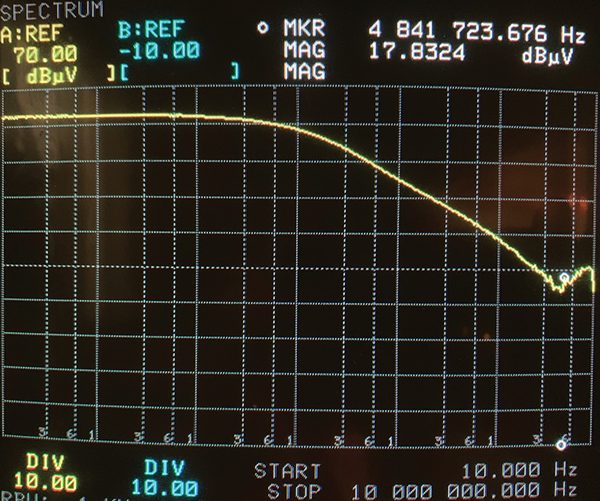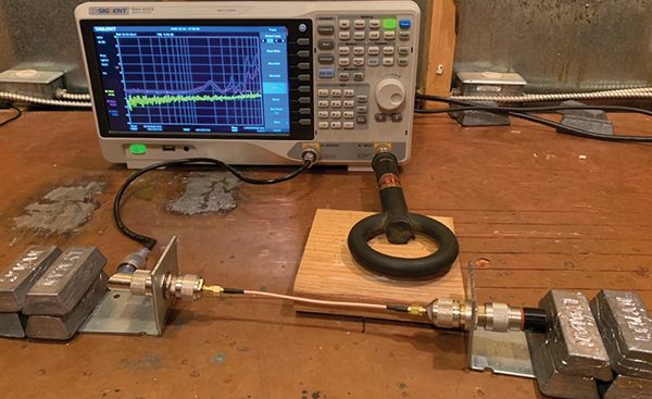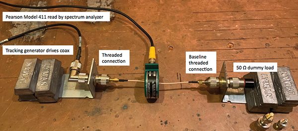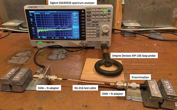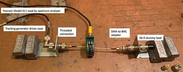 The obvious close probe measurement for leakage from a connector is a loop probe placed adjacent to the leaky connector while the test coax is driven directly from a tracking generator into a 50 Ω dummy load as shown in Figure 6. This would have worked, except the only probe available was an Empire Devices MP‑105 rated for use from 20 MHz to 1 GHz and it was not sensitive enough below about 100 MHz for the purpose of this measurement.